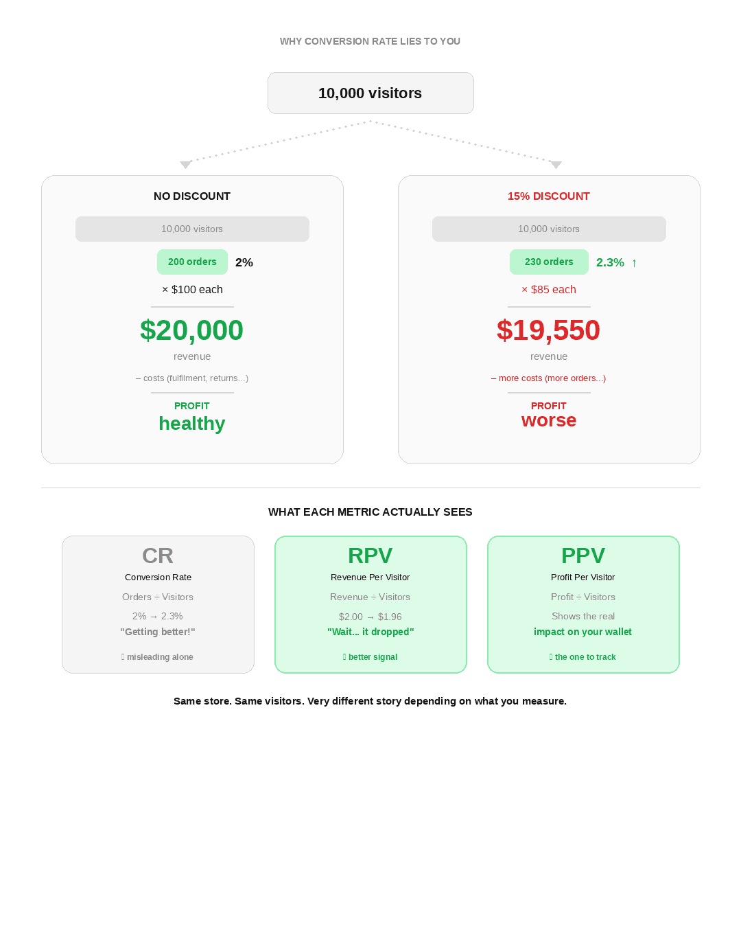 PPV, or profit per visitor, is your RPV minus your costs. For example, if you offer a 20% discount, your conversion rate might go from 2% to 3%, but your profit margin could vanish. Your PPV goes down, so you're actually in a worse position. PPV is the only metric that shows if a change truly helped.